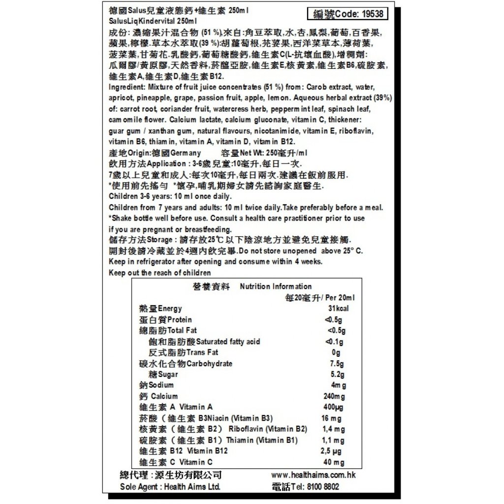 德國Salus兒童液體鈣+維生素 250ml