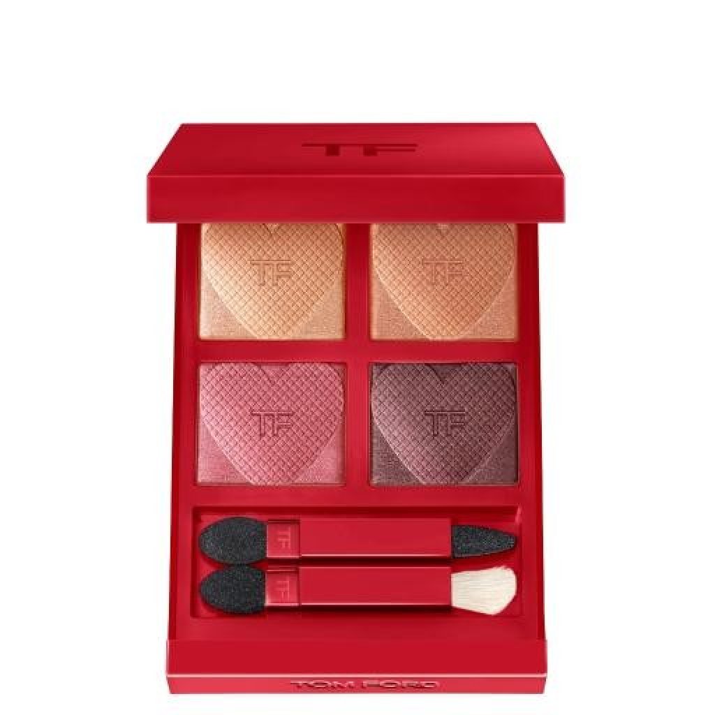 TOM FORD 幻魅四色眼影盤 Love Collection #04 HoneyMoon(蜜月紅棕)是經典熱銷的奢華紅棕色系。限量版採用浪漫的心形壓紋與紅色包裝。此盤包含緞光、金屬光及微光質地,完美結合蜜桃、沙棕、梅子與深紫色,能乾濕兩用,打造細膩溫柔或煙燻深邃的高顯色妝容,輕鬆駕馭知性與迷人風格。