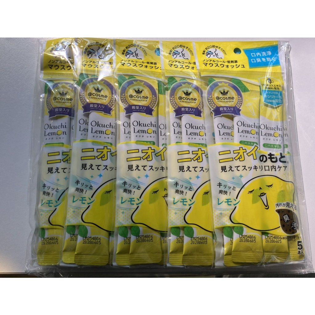 日本Okuchi Lemon 蜂膠檸檬味 無酒精低刺激配方 固化牙垢 預防口臭 便攜式旅行裝漱口水(5包裝) 11ml x 25包